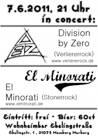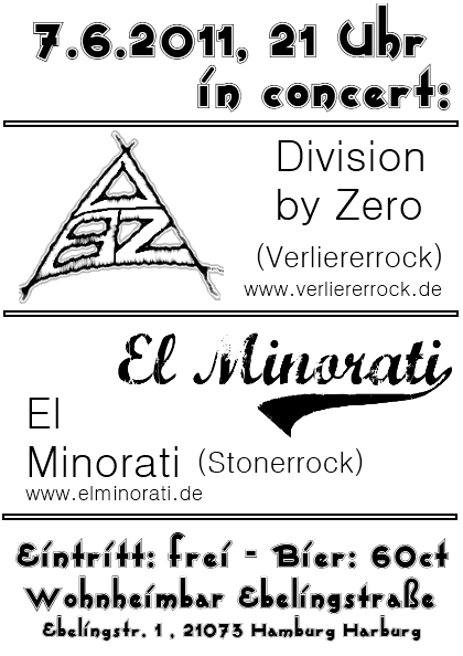Am Di, 7.6.2011 ab 21 Uhr gibt es wieder was auf die Ohren. El Minorati und Division by Zero rocken die Wohnheimbar Ebelingstraße in Hamburg Harburg. Eintritt ist frei, Bier und Getränke gibt es für 'n Appel und 'n Ei. Es gibt also keinen Grund NICHT zu kommen! Wer die Wohnheimbar in der Ebelingstraße nicht kennt, der klicke HIER und erfahre den Ort. Hier der Flyer: